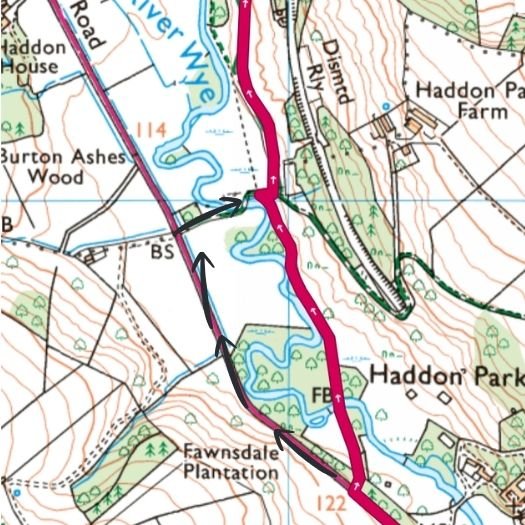 In wet weather this path floods. The River Wye bursts its banks, and the path can be under a foot or more of water. If the river (and the paths) looks flooded, you can follow the road to the junction and then turn right to get back onto this route.