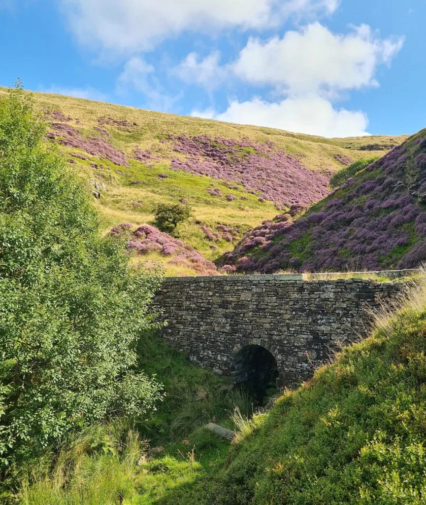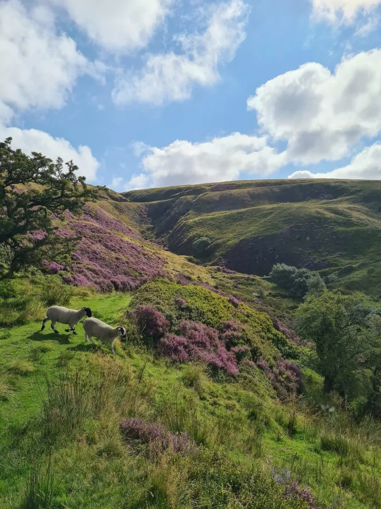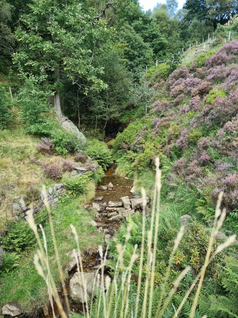 Following Binn Lane to the right we discovered the gateway to Binn Moor, complete with moors guardians aka sheep. The moorland here looks spectacular with the heather in full bloom. The path forks and we took the lower path which leads to the pretty Rams Clough Bridge. When we had crossed the bridge I nearly came a cropper with a lamb. We must have startled him and he ran towards me, almost taking my legs out from under me!