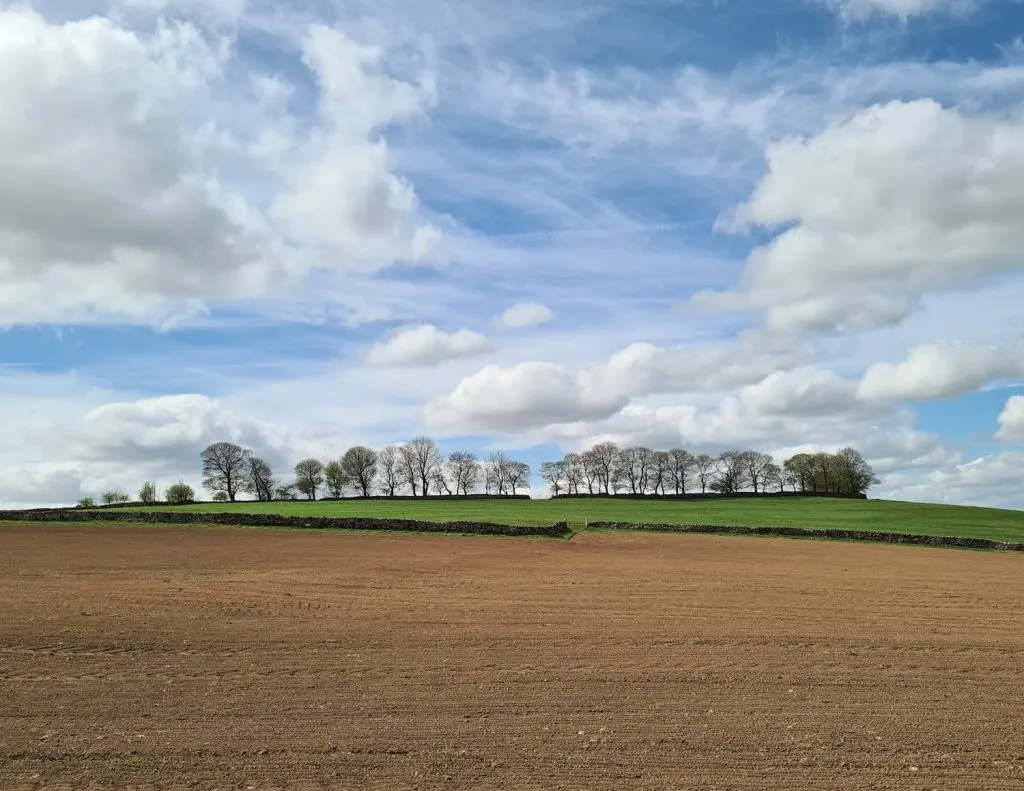 Following the footpaths, we made our way to the footpath passing close to the summit of Tissington Hill. As this is on private land, and the field had just been ploughed and crops sewn, we walked around the edge of the field to see if we could get a view of the trig point. Unfortunately it’s in the woods on the other side of another field, so we couldn’t even see it! We headed back and passed through the farmyard, then headed down into Dovedale. From this path you could just make out the trig point on the horizon – just!