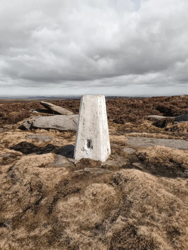 This trig point has it’s own mini lake nearby, in keeping with the soaking wet theme! We had a quick snack stop in the nearby Margery Stones to shelter from the wind as it was freezing.